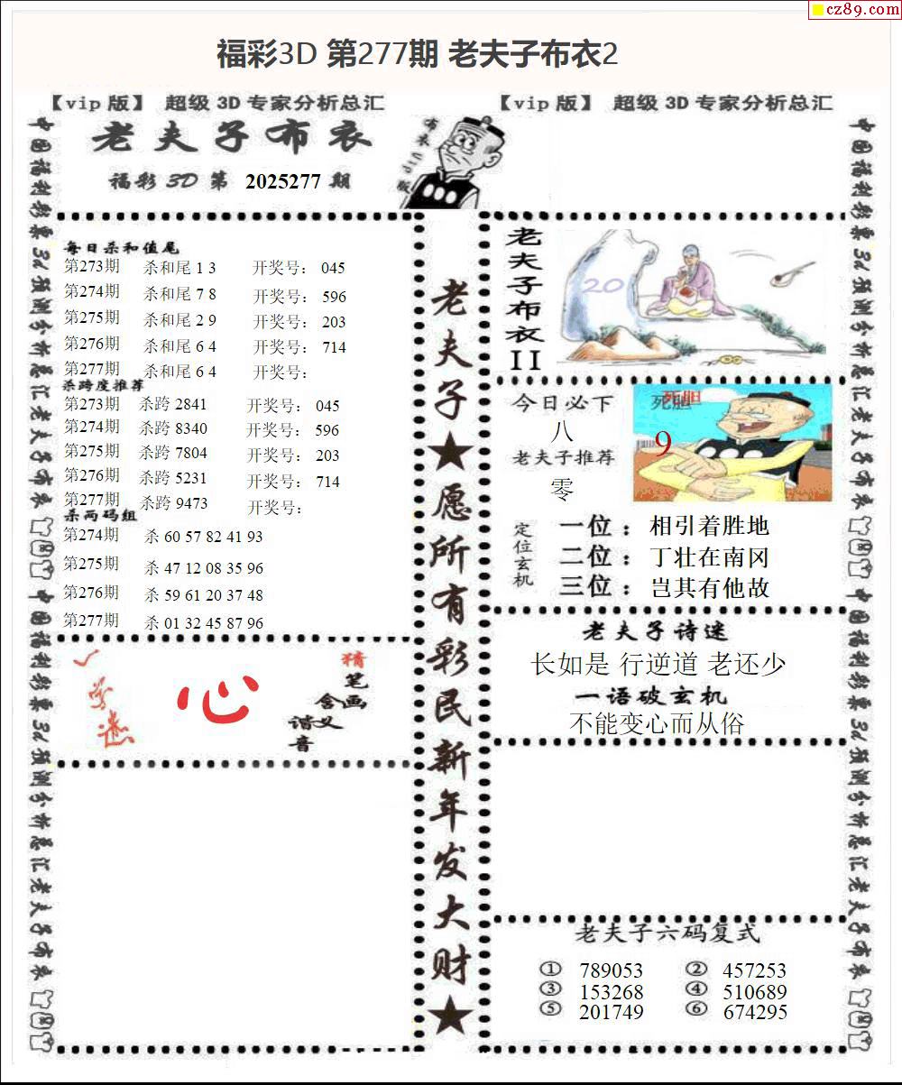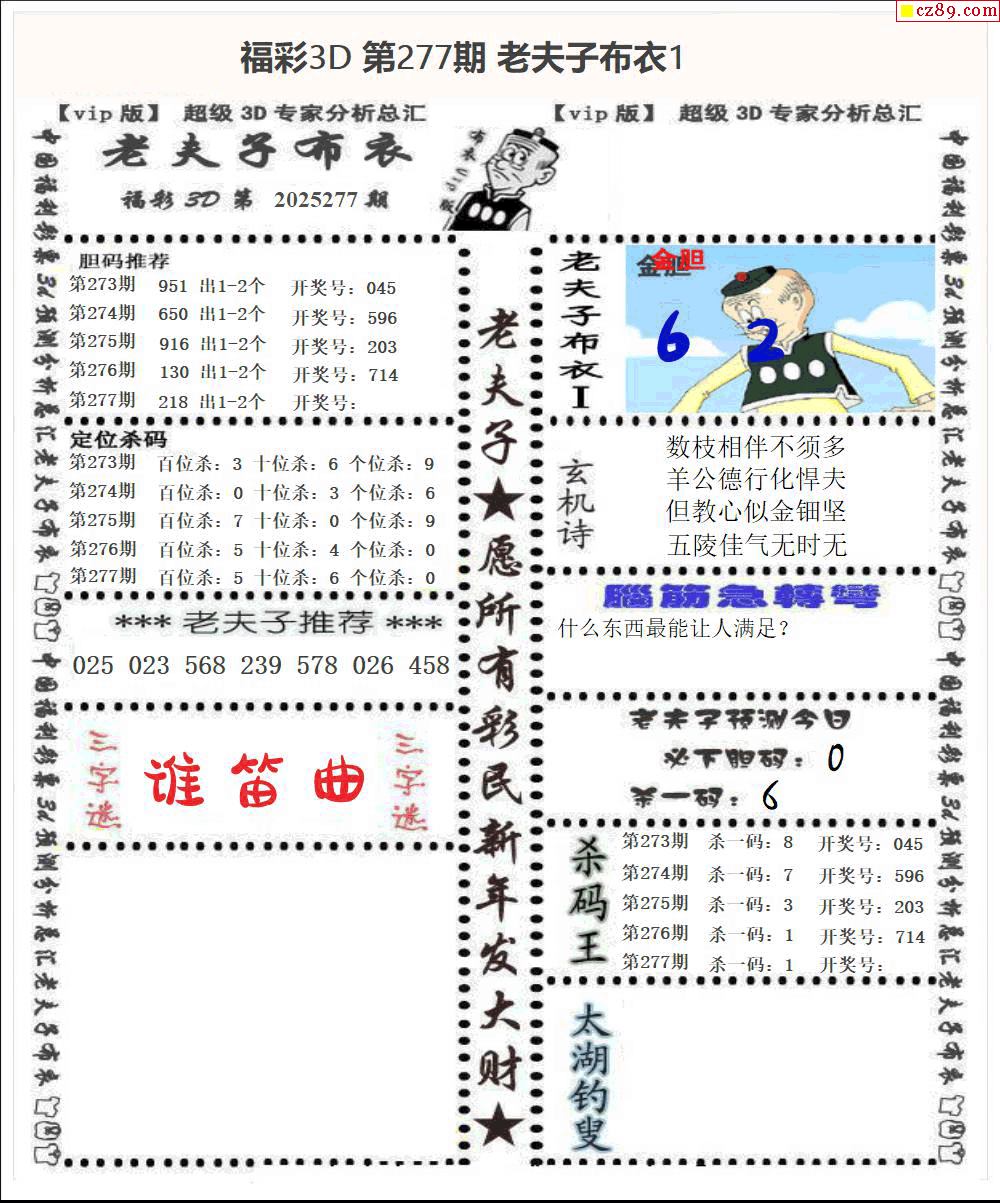 老夫子布衣2025277期3d图谜